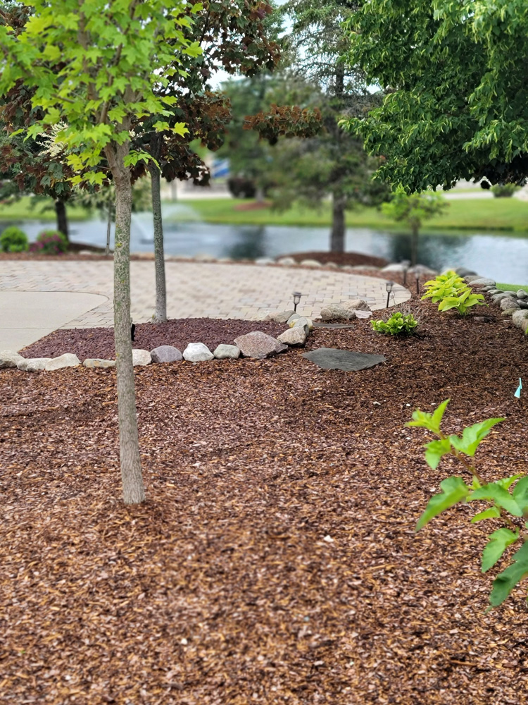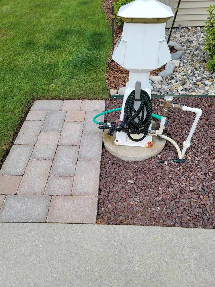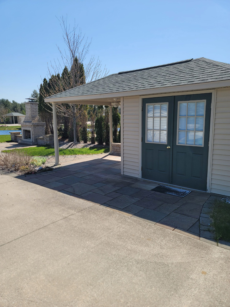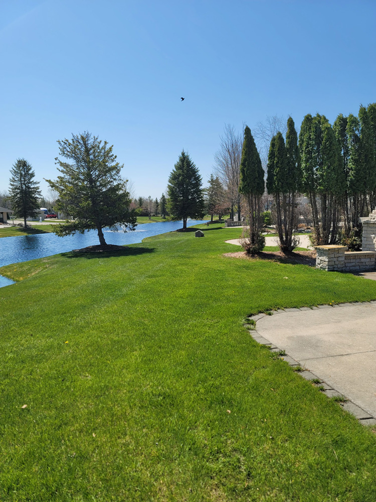 Here is ‘Stunning’ Pull-in pond lot located in the far west side of the North Loop on Forest View Drive facing east, which is close to the North Clubhouse fitness center, laundry and private shower suites. This ample sized lot size is 46’ wide x 100’ deep. Enjoy the view as you Pull-into this lot and overlook the North Loop cascading ponds with fountains. Most impressive on this well thought out landscape design is the Rosetta/Claremont gas fireplace with pillar extensions on each side and a paver patio area for seating to enjoy a cozy fire on those crisp Michigan evenings. At the road side there is a 10’x10’ Coach House with a 10’x10’ porch extension. Notice the doors on the Coach House have been placed to the driveway side for easier entry and to allow more usable space under the extension for furnishings. The Coach House has electric installed and is partially finished inside. Brick pavers have been installed from the driveway up to the Coach House doors and extend around up to and around the porch extension. A soldier row of brick pavers borders the driveway on each side and around the pond side creating a finished look. Enjoy your privacy here with mature privacy trees/hedges on both sides. Extensive landscaping with trees, bushes, perennials and a beautiful display of enormous hydrangea bushes are all irrigated with a sprinkler system. Decorative stones line the utility side of the lot and behind the fireplace.