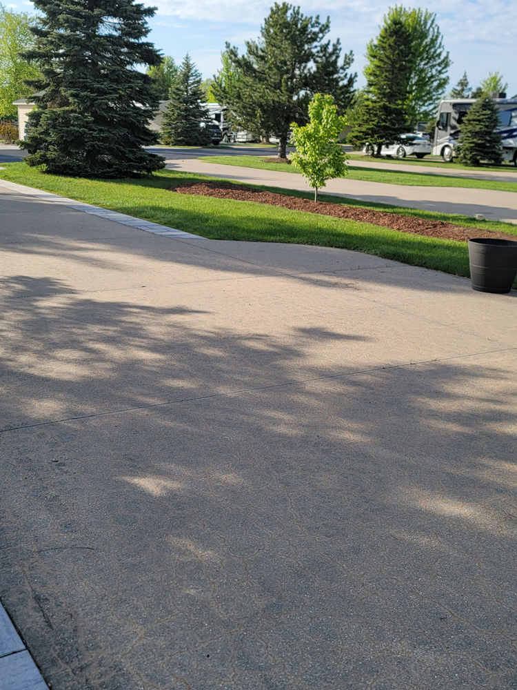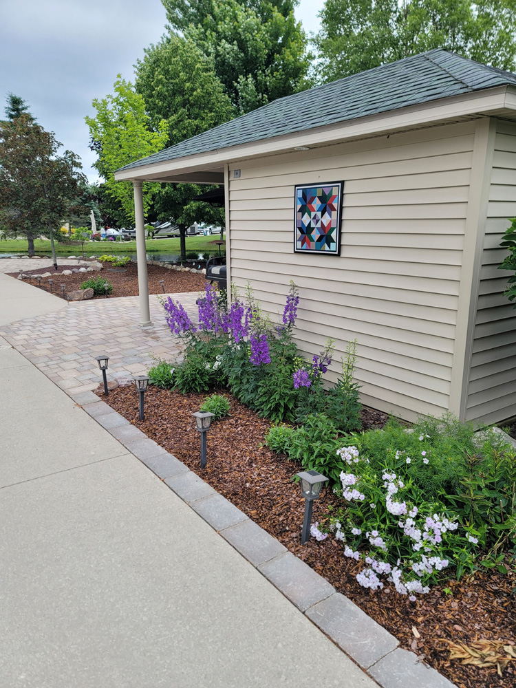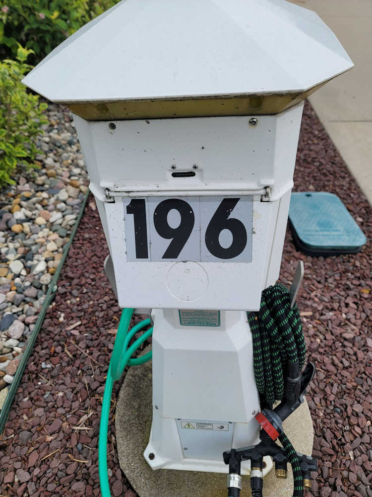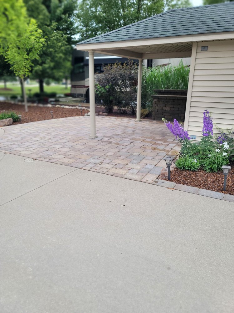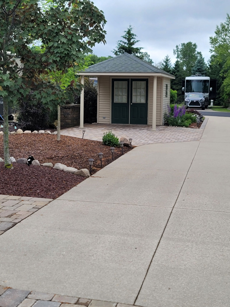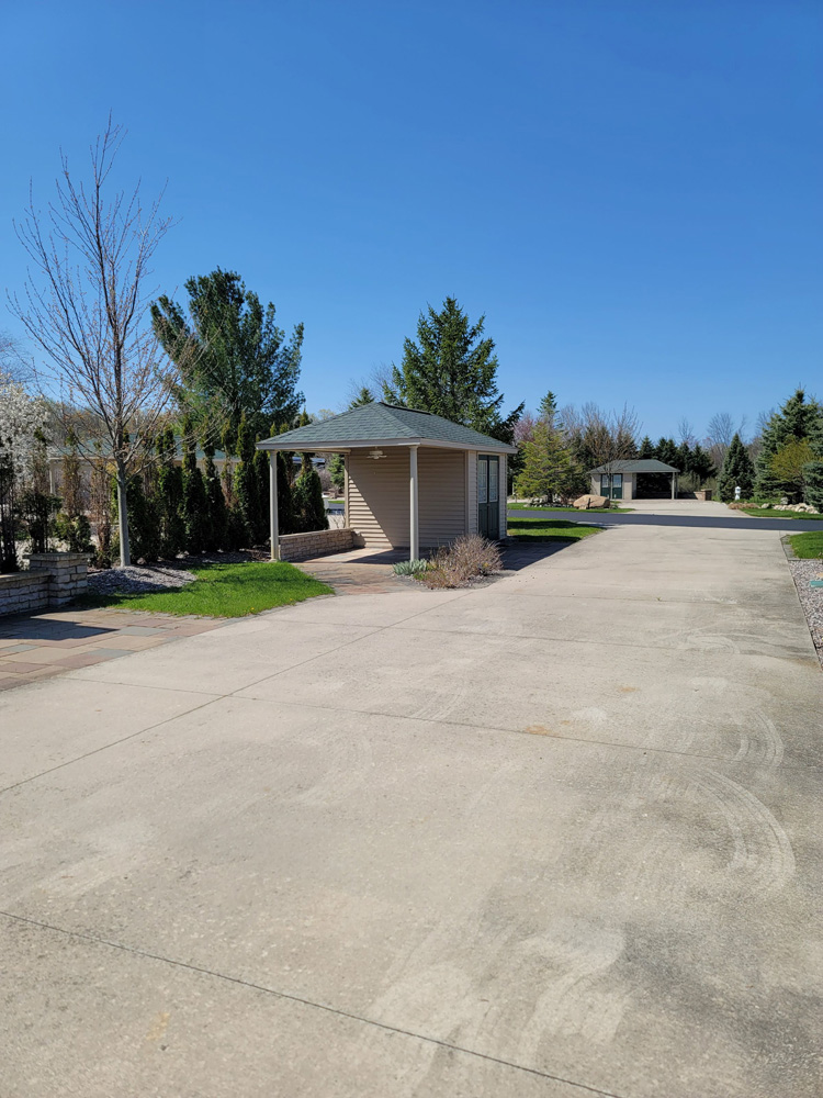 Nice pull-in pond site with an unobstructed fountain view. Easy to pull into North Loop, Class-A only, pond side lot located on Traverse Bay Drive. This is a nice deep lot 46’ wide by 100’ deep. Just a short walk to the North Clubhouse Fitness Center, Laundry and Bath/Showers. This site offers perfect North & South views of the pond and has a fountain that lights up at night directly in front of the extended patio. The concrete drive has been expanded with a circular extension at the pond side of the lot for an additional patio area. There is also a sidewalk leading to the Coach House. All of the concrete has been improved with the New Look Concrete Epoxy Coating in a tan shade with a square geometric pattern. Includes a 10’ x 10’ Coach House with electric installed and a weathervane at the top of the roof. Plenty of decorative stones have been placed around the Coach House and next to the sidewalk leading to the Coach House. More decorative stones along with boulders have been added as a planting berm on the patio side and at the pond side encircling a nice mature maple tree. An irrigation system has been installed for the grass and numerous shrubs, bushes and perennials. A nice mature blue spruce tree greets you at the roadside of the lot.